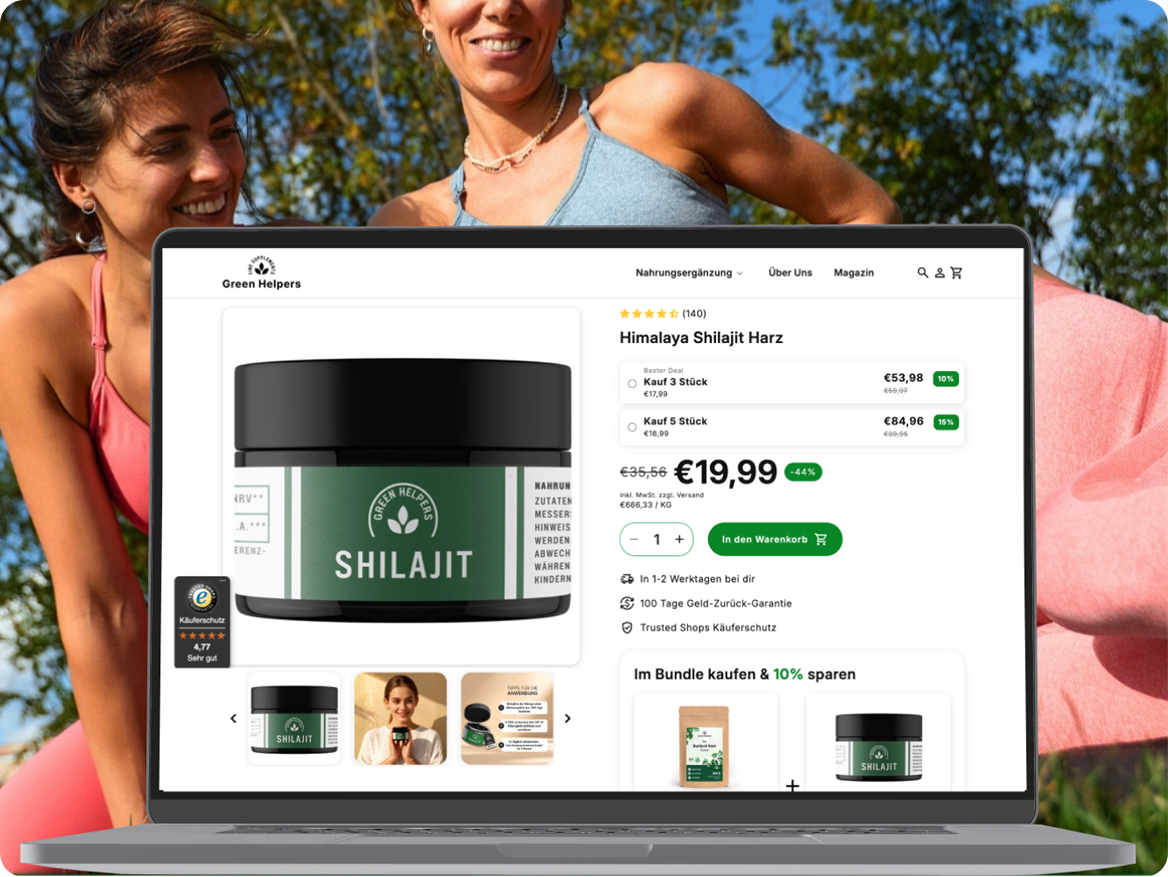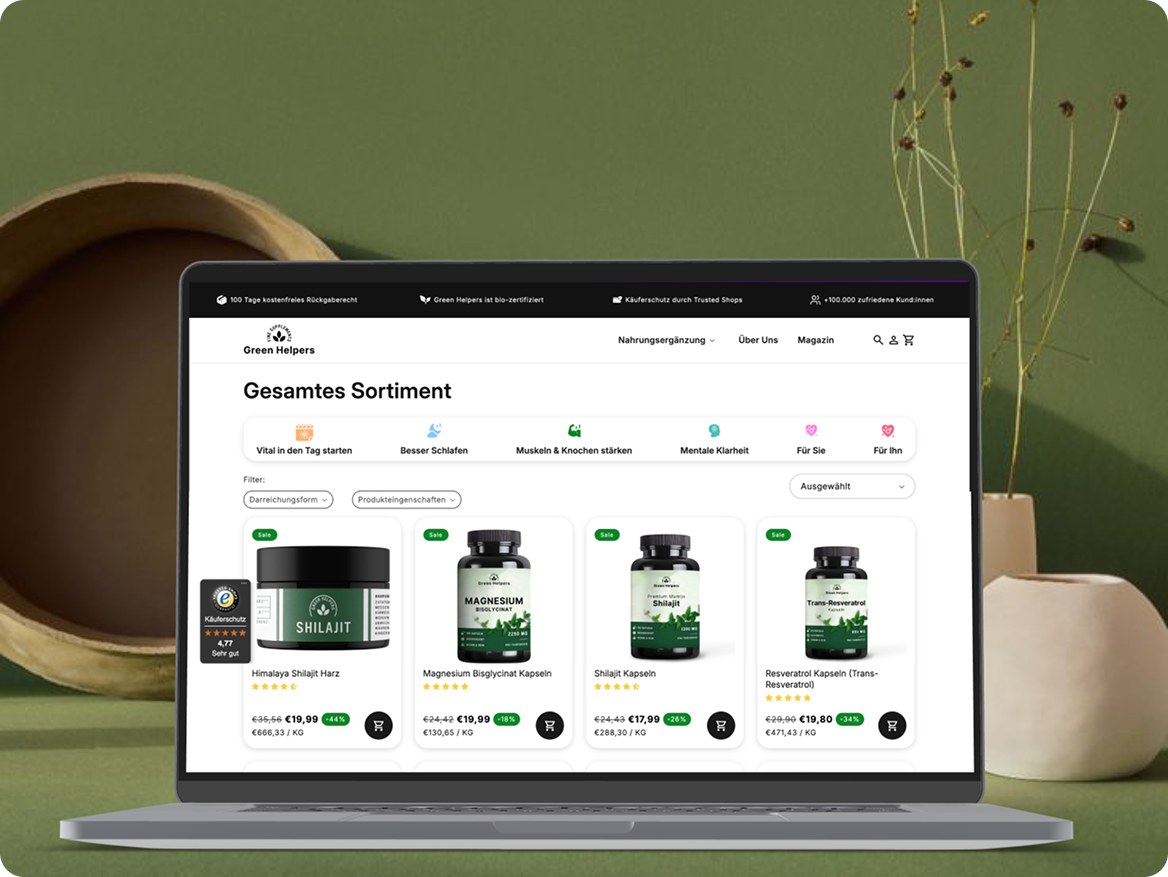 Green Helpers präsentiert sich heute als klare Marke für natürliche Vitalität. Instagram stieg von 200 auf über 3.100 Follower, TikTok erreichte über 3.400 organisch. Die Website verbindet Produkte, Mission und Community nahtlos. Inhalte klären auf, bauen Bindung auf und treiben Anfragen voran. Ein starker Boost für nachhaltigen Erfolg.